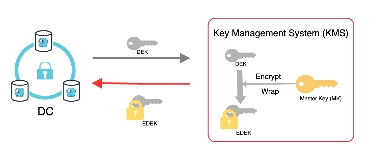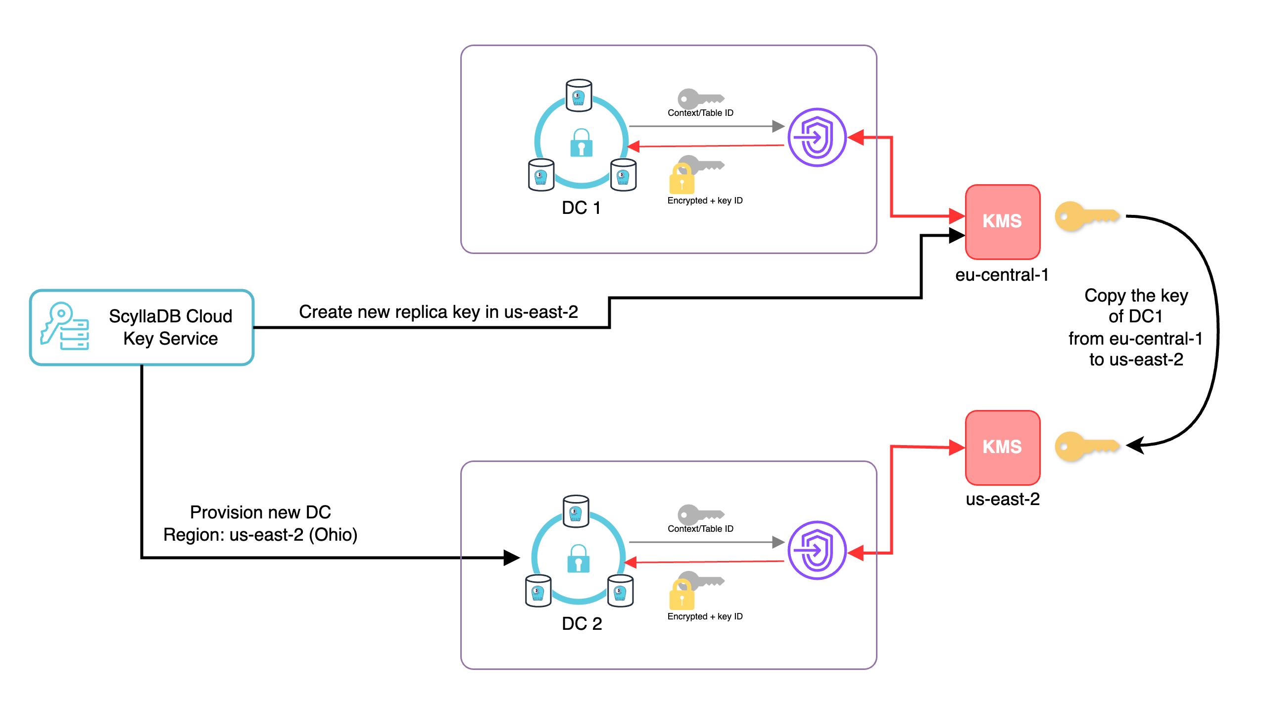 Adding new data centers to the ScyllaDB cluster will create additional local keys in those regions. All master keys support multi-regions, and a copy of each key resides locally in each region – ensuring those multi-regional setups are protected from regional outages for the cloud provider and against disaster.