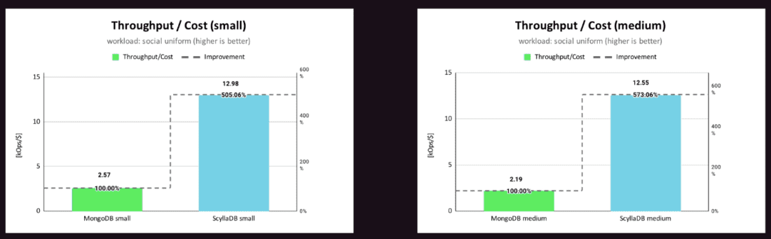 The results show an expected increase in throughput: for ScyllaDB 56% and for MongoDB 49%.