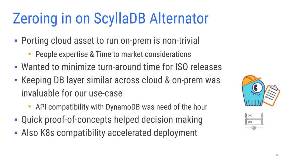 Moving cloud assets on‑prem is not trivial; expertise, time‑to‑market, service parity, and scalability all matter. We also wanted to keep our release cycles short: in the cloud we can push features every sprint; on‑prem, we still need regular updates. Keeping the database layer similar across cloud and on‑prem minimized rework. Quick proofs of concept confirmed that ScyllaDB + Alternator met our needs, and using Kubernetes on‑prem let us port microservices comfortably.