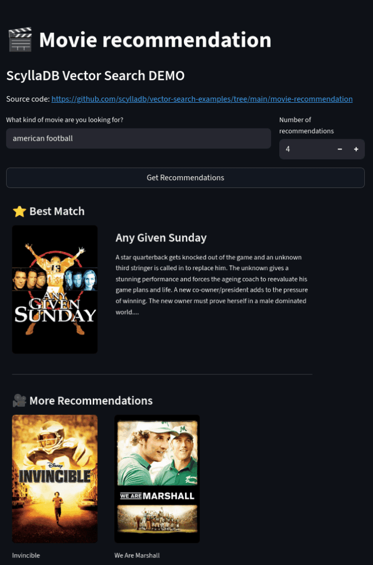The application allows users to input what kind of movie they want to watch. For example, if you type “American football,” the app compares your input to the plots of movies stored in the database. The first result is the best match, followed by other similar recommendations. This comparison uses ScyllaDB Vector Search.