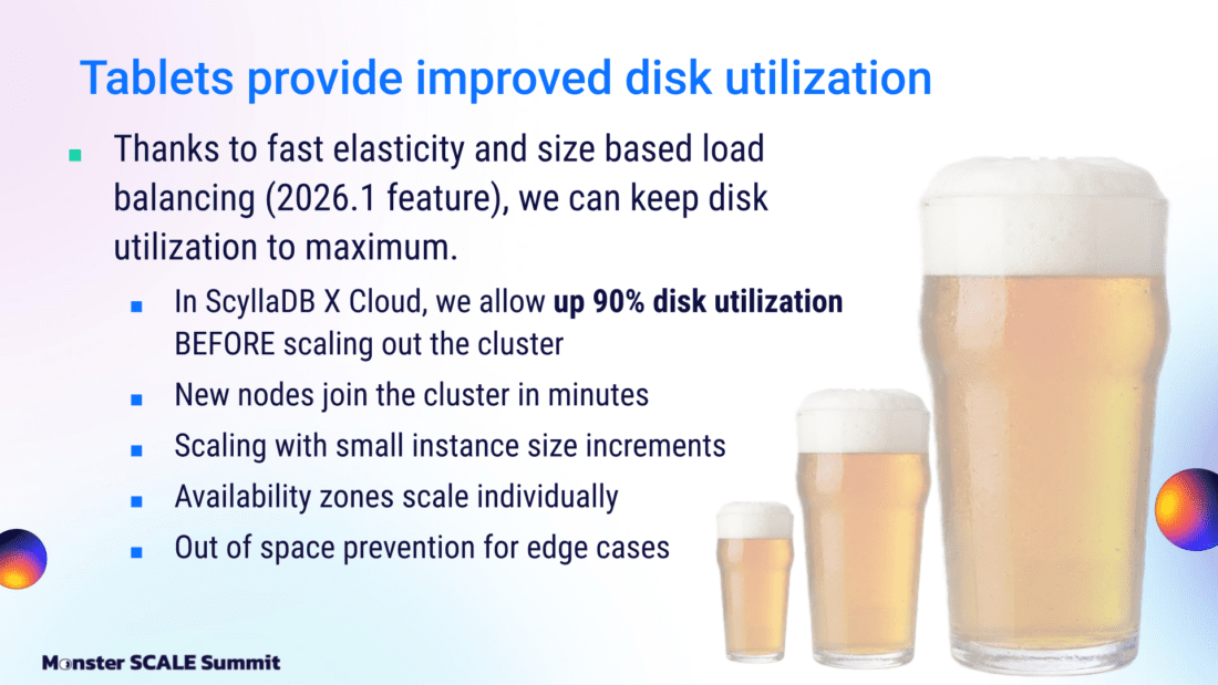 As Avi’s talk explains, we can scale out in minutes and the tablets load balancing algorithm balances nodes based on their storage consumption. That means more usable space on an ongoing basis – up to 90% disk utilization.