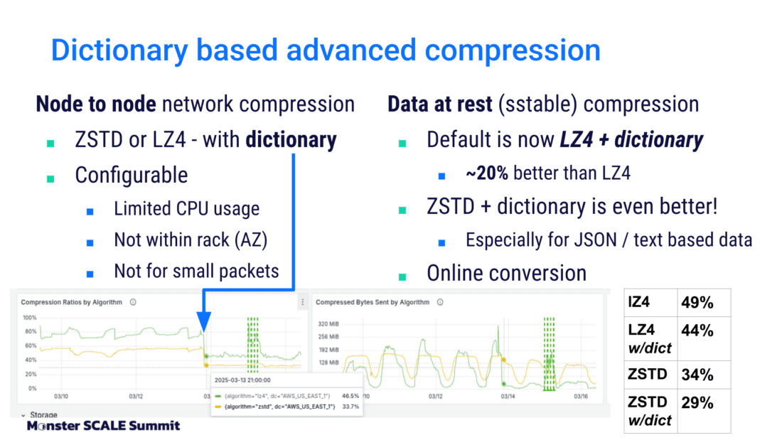 ScyllaDB Cloud has always had compression enabled by default, both for data at rest and for data in transit. We compress our SSTables on disk, we compress traffic between nodes, and optionally between clients and nodes. In 2025, we improved its efficiency up to 80% by enabling dictionary-based compression. The compressor gains better context of the data being compressed. That gives it higher compression ratios and, in some cases, even better performance.