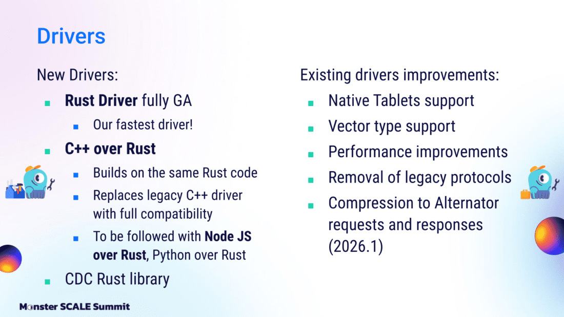 We also reached general availability of our Rust driver. This is interesting because it’s our fastest driver. Also, its binding is the foundation for our grand plan: unifying our drivers under the Rust infrastructure. We started with a new C++ driver. Next up (almost ready) is our NodeJS driver – and we’ll continue with others as well.