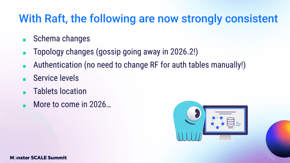 Other features that use Raft-based topology are authentication, service levels (also known as workload prioritization), and tablets. We are actively working on making strong consistency available for data as well.