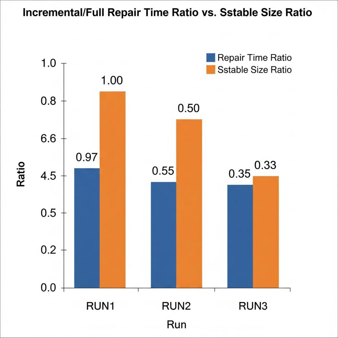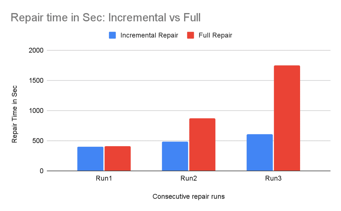 In the first round, nearly all the data was new, so the repair time was almost the same as with full repair. In the second round, with a 50/50 split, the time dropped by half. In the third round, as the repaired set became dominant, incremental repair took only 35% of the time that a full repair would have taken.