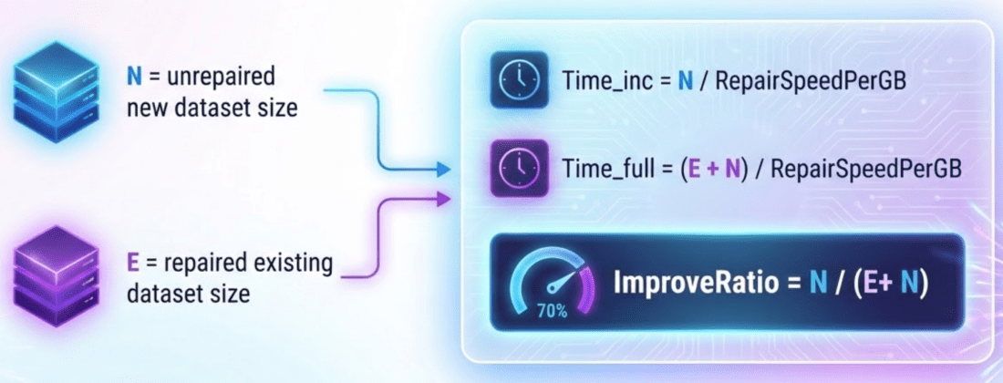 To understand how this approach translates to performance improvements, let’s model the improvement ratio. Say that n is the size of your new unrepaired data and E is the size of your existing repaired data. A full repair works on E plus n. Incremental repair works only on n. So, the improvement ratio equals n divided by E plus n.