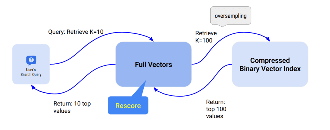 | Large dataset, memory-constrained | Use i8 or f16 with oversampling of 3.0–10.0. Add rescoring: true only if very high recall is required. |